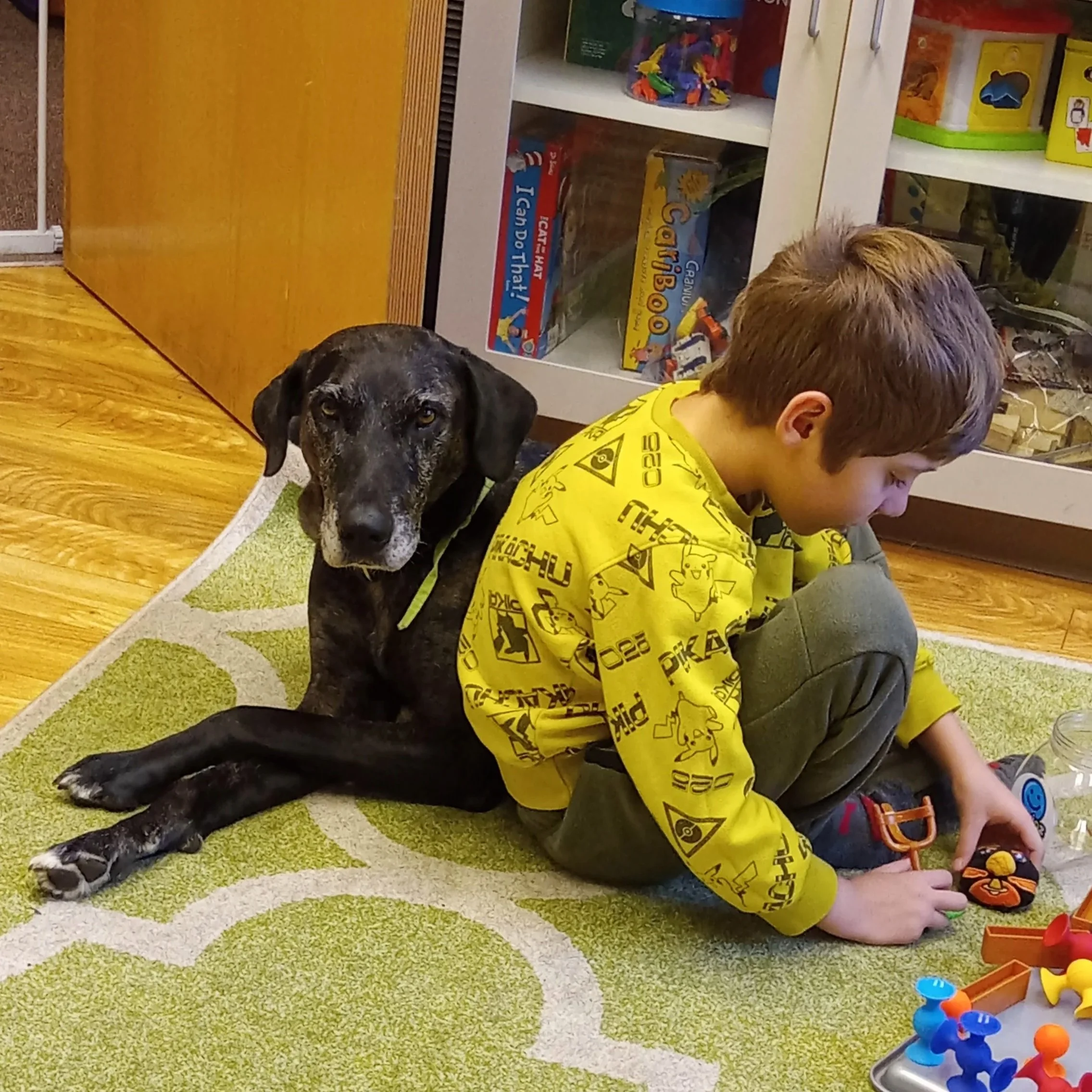 When allowing Delta to choose where she goes during a session, she often opts to be close to more anxious or resistant kids. Her calming presence then helps me be more productive within an otherwise challenging session.