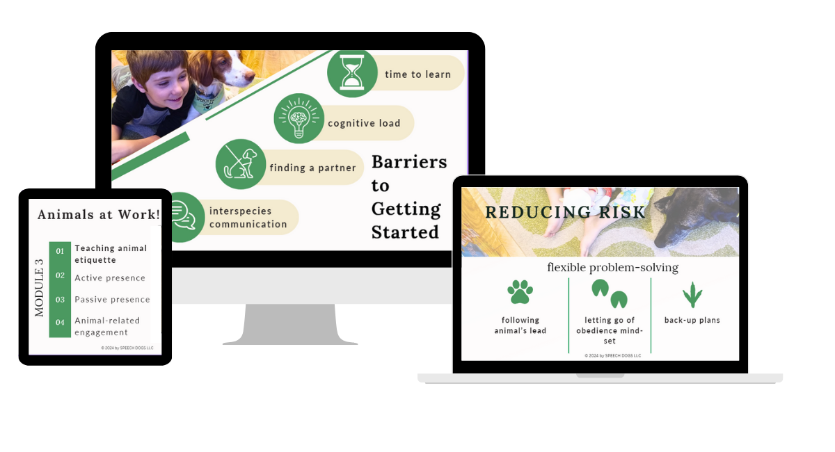 Please contact me at sharlet@speechdogs.com! I'm passionate about this work and the benefits it can bring, and I'm happy to chat so you feel confident in applying your knowledge of animal-assisted interventions. Since I'm constantly working to expand my own knowledge base, chances are if I don't have the answer myself I can direct you to someone who does!